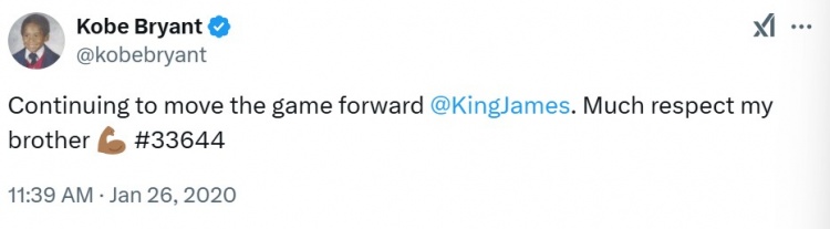 - 五年前的今天:科比人生最后一条推特 恭喜詹姆斯总得分超越自己